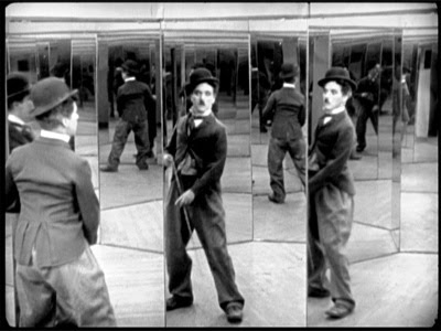 This sense of mirrors-reflecting-mirrors gets its literal expression in a terrific scene when the Tramp escapes the cops by dashing into a funhouse Mirror Maze. Its walls kaleidoscopically reflect so many images of the Tramp that he's confused about where to turn without conking into a hard surface. Holding a mirror up to one's self is a worthy purpose for any artist (and by this point in his career Chaplin definitely thought of himself as an Artist); a mirror image also distances us in the audience one more layer further from its subject, affording us a more detached or encompassing perspective. It would be interesting to know what Chaplin thought, as he watched The Circus from our perspective, while viewing himself viewing himself.