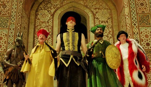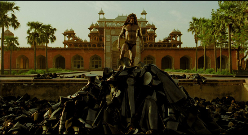 Meanwhile, Tarsem's startling visual style bursts and splashes with primary colors and dazzling alien dreamscapes — all real, all filmed without CGI in Tahiti, South Africa, Jodhpur, Udaipur, and a dozen more countries over several years. Via Colin Watkinson's cinematography,we get breathtaking compositions of deserts and palaces and vast blue cities. Even his transitions can bend toward the Daliesque — a blue butterfly into an island in the middle of the sea, a spilled cup of coffee into a pool of blood, a villain's features into the elements of an environmental setting. There's the labyrinthine well that defies architectural geometry like a cathedral-sized Escher painting. Birds fly from the mystic's mouth when he's beaten. Charles Darwin (aided by his "brilliant colleague," an intelligent monkey named Wallace) devises an escape via a swimming elephant.