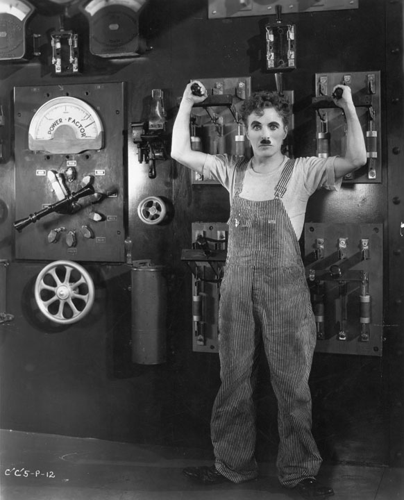 Back then he was a little fellow alone in a nascent society of other immigrants and vagabonds and petty miscreants. Now in Modern Times he is billed as "a factory worker," and he doesn't exchange his work overalls for the familiar Tramp outfit until almost twenty minutes have passed. In earlier films the Tramp was an underdog up against the authorities or a unibrowed bully or the Alaskan frontier. Now he's a more emblematic Everyman, and his antagonist is society itself. The enemy is named in the movie's title.