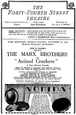 www.marx-brothers.org has more about Animal Crackers on Broadway, including sections trimmed out for the film and pages from the program book.