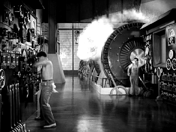 And wow — what a stylized look at the Machine Age this is! Our modern times are memorably represented in gargantuan dynamos that could have blazed from the cover of Amazing Stories magazine. The factory's boss — when he's not playing with puzzles or reading comic strips — observes the workers via giant two-way video screens. (The sparking Jacob's Ladder alongside his screen is a nice Frankenstein touch.) The Tramp can't even take a break for a smoke in the washroom without his sour-faced boss' wall-sized Big Brother mug (pre-Orwell, mind you) appearing and barking orders to get back to work. When the boss picks up a newspaper, we can imagine him reading about that nasty business involving the scientist Rotwang across the sea in the German super-city of Metropolis.