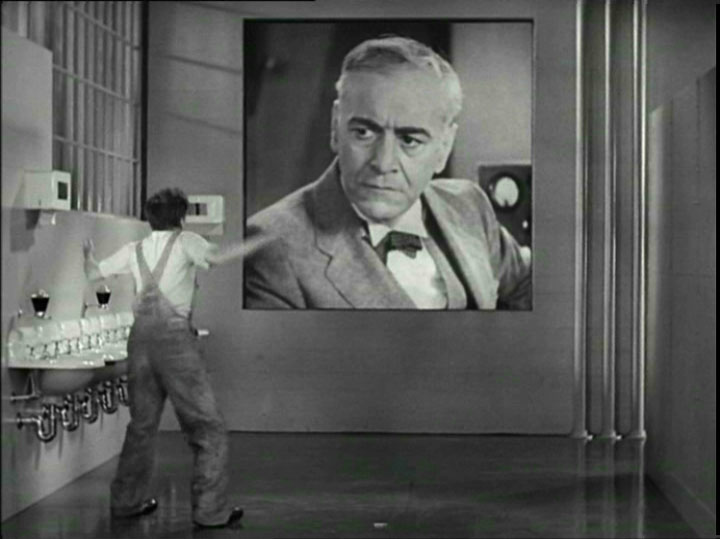 And wow — what a stylized look at the Machine Age this is! Our modern times are memorably represented in gargantuan dynamos that could have blazed from the cover of Amazing Stories magazine. The factory's boss — when he's not playing with puzzles or reading comic strips — observes the workers via giant two-way video screens. (The sparking Jacob's Ladder alongside his screen is a nice Frankenstein touch.) The Tramp can't even take a break for a smoke in the washroom without his sour-faced boss' wall-sized Big Brother mug (pre-Orwell, mind you) appearing and barking orders to get back to work. When the boss picks up a newspaper, we can imagine him reading about that nasty business involving the scientist Rotwang across the sea in the German super-city of Metropolis.