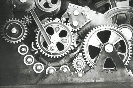 Soon we come one of Chaplin's indelible images. It's the crazed Tramp being drawn into The Machine, where he's threaded through giant cogwheels, stopping only to blithely tighten another pair of bolts.