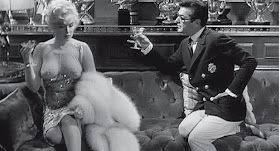 Unlike her "sex pot" predecessors such as Jane Russell and Jean Harlow, Monroe exuded the aura of a nonthreatening "nice girl" — one who between the sheets could happily take the right man to the stars and back, and somehow she convinced many ordinary Joes that they were The Right Man. Even in poor films (such as her next one, 1960's Let's Make Love) she expressed a preternatural, and seemingly congenital and unprocessed, ability to swirl together percolating-pheromones sexuality and girlish vulnerability. Had she lived, would that have survived the next four decades? How much of the aura that surrounds her even today comes rooted in the tragedy of her final years and early death? I don't know. What I do know is that I enjoy watching her in Some Like It Hot. No mystique need apply.