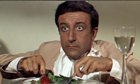 After his best Inspector Clouseau film, A Shot in the Dark, the unnecessarily dragged-out Pink Panther series has always left me lukewarm. He was at his best when you could feel he wasn't hemmed in, when he could just go with his own well-honed instincts. But too often Blake Edwards' tight-ass Pink Panther films have Sellers displaying all the witty improvisational zing of a Celine Dion concert. Technically he's terrific, but the too-easy laughs are hit or miss. In my head the Pink Panther films are mashed-up into a single Good Parts video — "But that's a priceless Steinway!" Clouseau: "Not anymore." ~ Clouseau and the "beumb" ~ the blind man's "mihnkey" ~ Clouseau asking Victor Spinetti for a "rheum" in a posh hotel ~ mishaps with swimming "pewls," and so on.