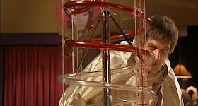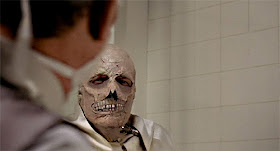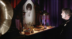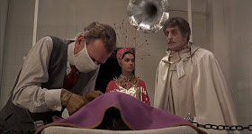 Pulling off this stunt meant that before the cameras rolled Price had to pre-record Phibes' soliloquies, rants, and Mad Doctor monologues, then physically play to the recordings without actually speaking. Expressing everything facially through heavy makeup (of two radically different types), Price manages to imbue Phibes with a sympathetic nature and macabre charm, even as we're watching him perform his diabolical acts.